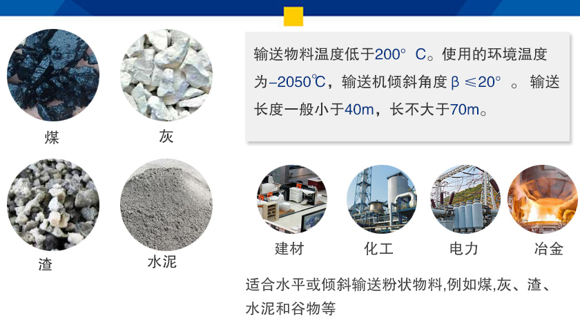粉末螺旋輸送機(jī)廣泛應(yīng)用于建材,化工,電力,冶金,木炭,糧食等行業(yè)。適合水平或傾斜輸送粉狀物料,例如煤,灰、渣、水泥和谷物等,輸送物料溫度低于200°C。使用的環(huán)境溫度為-2050℃,輸送機(jī)傾斜角度β≤20°。 輸送長(zhǎng)度一般小于40m,長(zhǎng)不大于70m。