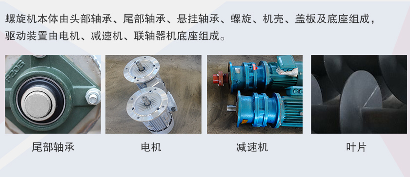 螺旋機(jī)本體由頭部軸承、尾部軸承、懸掛軸承、螺旋、機(jī)殼、蓋板及底座組成,驅(qū)動(dòng)裝置由電機(jī)、減速機(jī)、聯(lián)軸器機(jī)底座組成。
