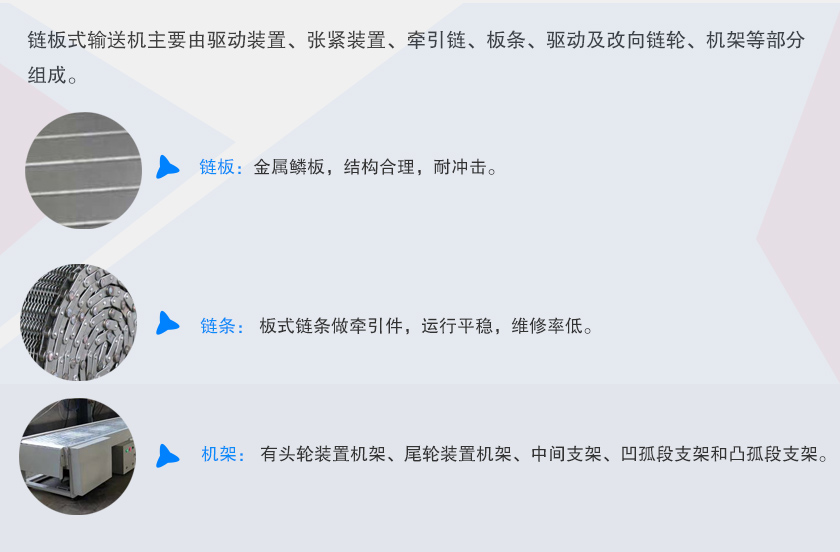 鏈板式輸送機主要由驅動裝置、張緊裝置、牽引鏈、板條、驅動及改向鏈輪、機架等部分組成。