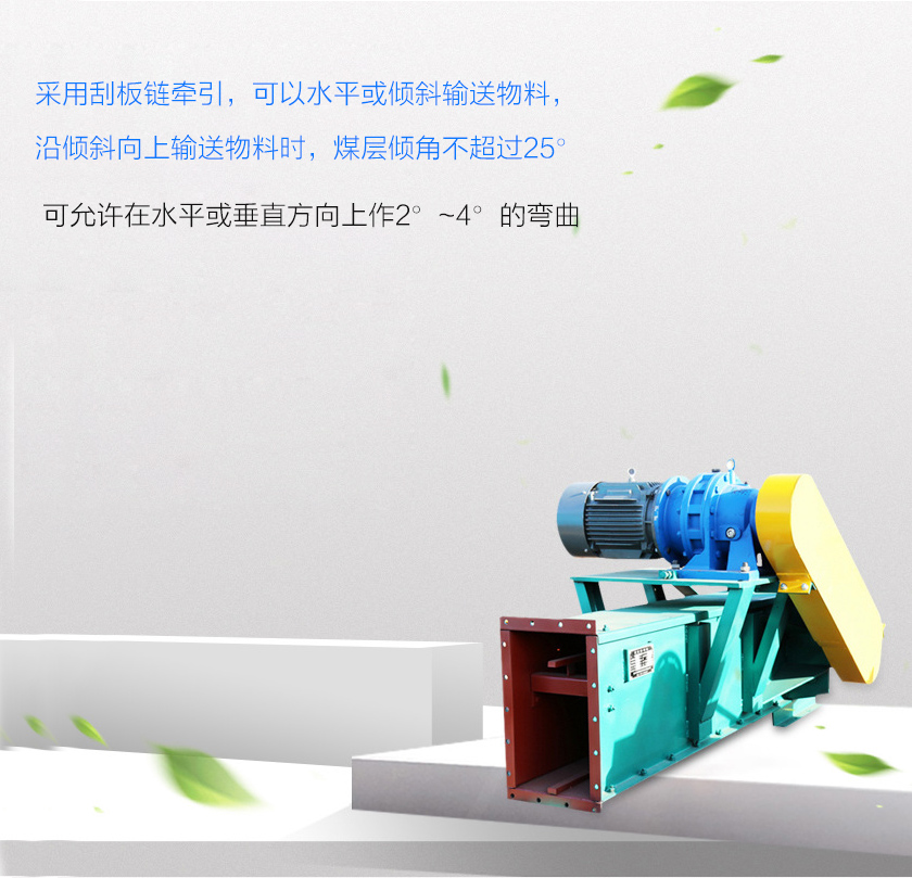 刮板鏈式輸送機簡稱刮板輸送機,主要采用刮板鏈牽引,可以水平或傾斜輸送物料,沿傾斜向上輸送物料時,煤層傾角不超過25°,向下輸送物料時,傾角不超過20°,當煤層傾角較大時,應該加裝防滑裝置,刮板鏈式輸送機相鄰中部槽在水平、垂直面內可有限度折曲的叫可彎曲刮板鏈式輸送機,可允許在水平或垂直方向上作2°~4°的彎曲。