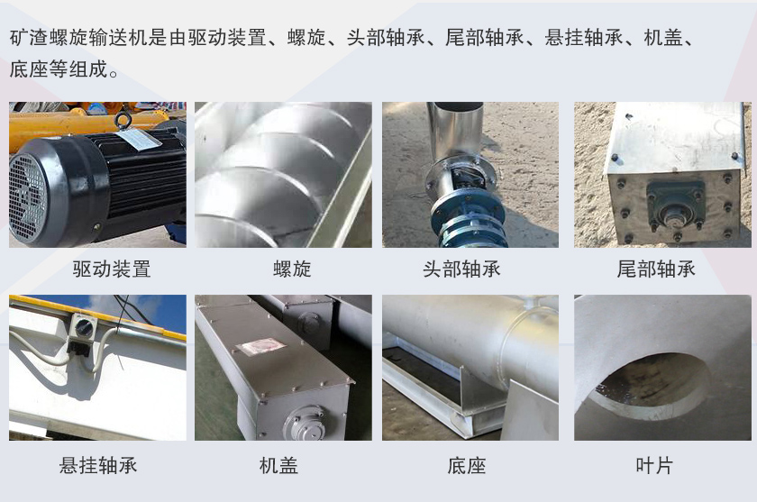 礦渣螺旋輸送機(jī)是由驅(qū)動(dòng)裝置、螺旋、頭部軸承、尾部軸承、懸掛軸承、機(jī)蓋、底座等組成。驅(qū)動(dòng)裝置:由電動(dòng)機(jī)、減速器、聯(lián)軸器等組成。螺旋軸與吊軸承、頭部軸承、尾部軸承聯(lián)接采用嵌入舌式,安裝拆卸不需軸向移動(dòng),維修方便,采用變徑結(jié)構(gòu),增大吊軸承處的容積,避免吊軸承與物料接觸,各傳動(dòng)部位采用浮動(dòng)聯(lián)接方式,頭尾軸承座均在殼體外,所有軸承采用多層密封和配合密封技術(shù),軸承使用壽命長(zhǎng)。
