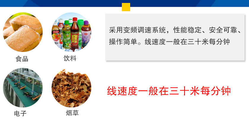 廣泛應用在食品、飲料、電子、煙草等行業,我們可以選用較小直徑的滾筒,使轉角連接更加方便,解決過渡問題。本設備適用于各種流水作業的生產廠家,中小型物品的物流輸送,動力系統采用變頻調速系統,性能穩定、安全可靠、操作簡單。線速度一般在30米/分鐘。