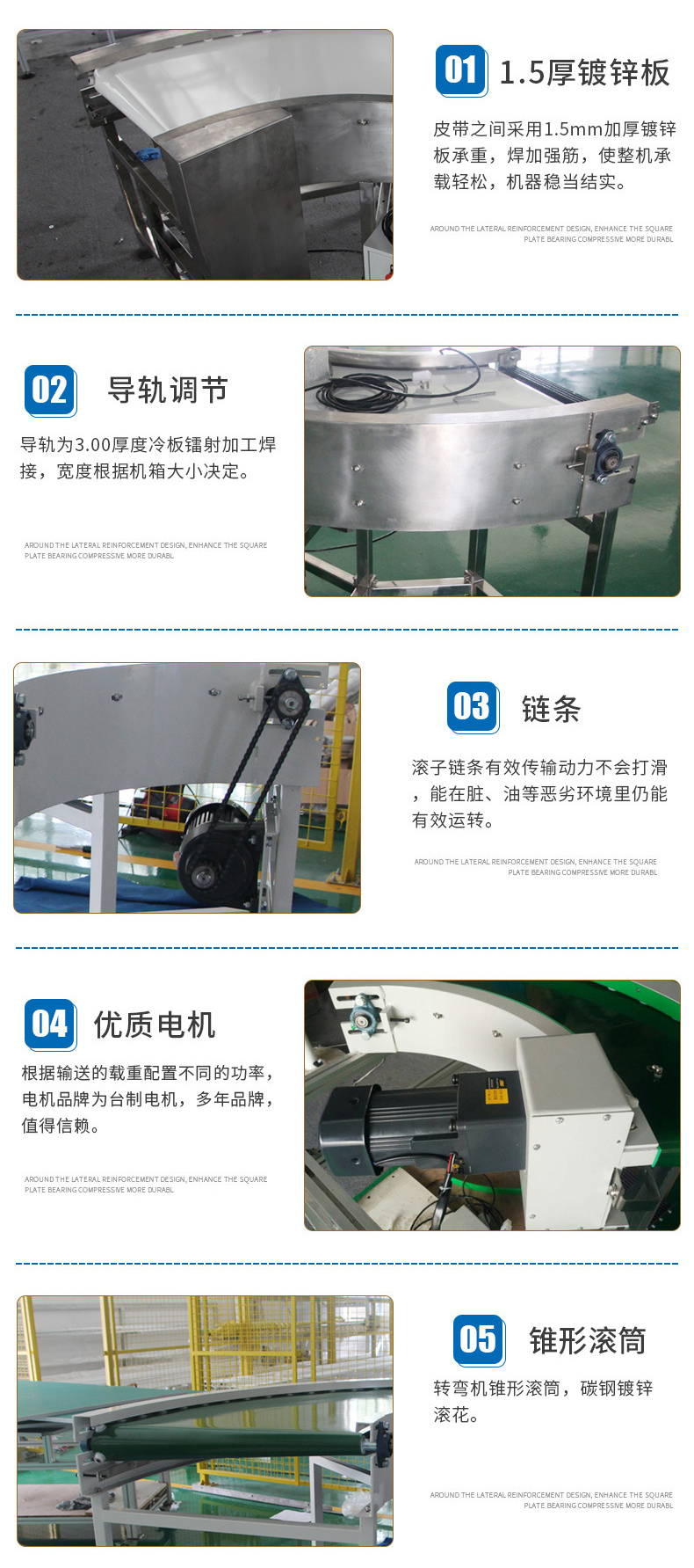 1、相較普通輸送機增加轉彎功能,可滿足各種輸送工藝要求。