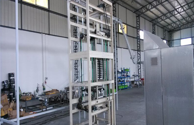 連續(xù)式垂直提升機(jī)主要由機(jī)殼、料斗、牽引件、機(jī)身、張緊裝置等部分組成。