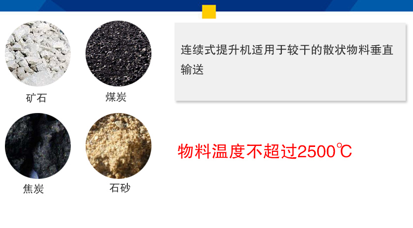 連續(xù)式提升機(jī)適用于較干的散狀物料垂直輸送,,如礦石、煤炭、焦炭、水泥、石砂等,可廣泛地應(yīng)用于建材、化工、煤炭、電力、港口運(yùn)輸?shù)刃袠I(yè)的物料輸送作業(yè)。