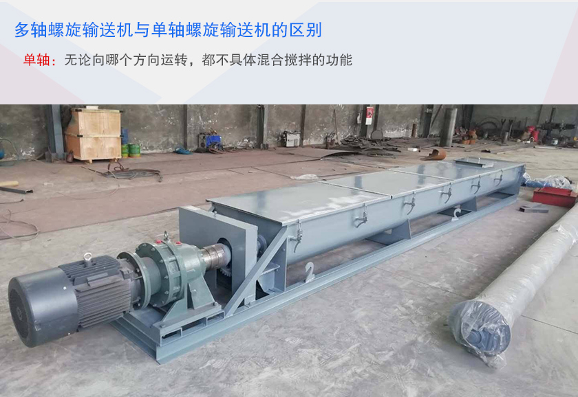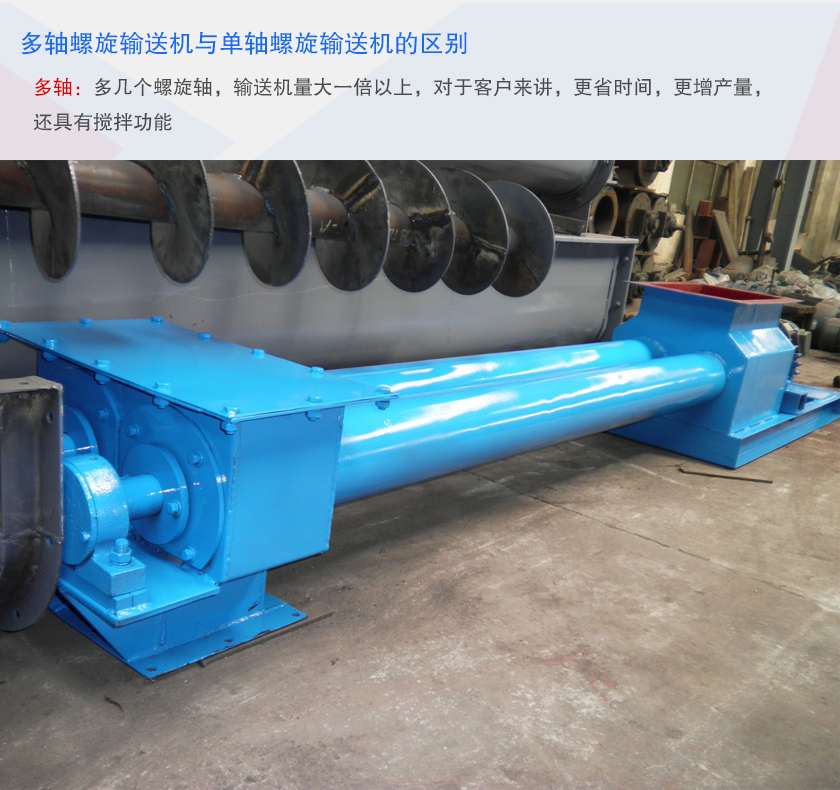 多軸螺旋輸送機與單軸螺旋輸送機相比多幾個螺旋軸,輸送機量大一倍以上,對于客戶來講,更省時間,更增產量,還具有攪拌功能,單軸螺旋輸送機無論向哪個方向運轉,都不具體混合攪拌的功能,而多軸螺旋輸送機則是兩邊螺旋軸轉向不同的方向(注:都向內側轉動)。所以當物料放入進料口時,會自動將物料轉動到中間,混合到一起。