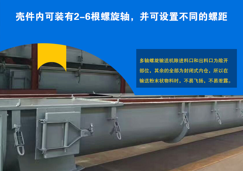 5、多軸螺旋輸送機除進料口和出料口為敞開部位,其余的全部為封閉式內倉,所以在輸送粉末狀物料時,不易飛揚,不易泄露。