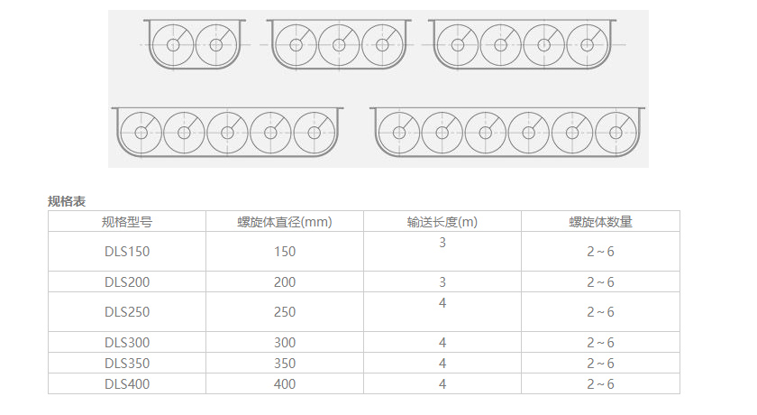 多軸螺旋輸送機由驅動裝置、料槽、螺旋葉片、螺旋軸、吊軸承、端部軸承、進料口和出料口組成。其驅動裝置有兩種,一種是電機、減速機由彈性聯軸器連接而成,減速機與螺旋軸之間常用浮動聯軸器連接。另一種是直接用配減電機。在配置螺旋輸送機時,盡量將驅動裝置和出料口同時安裝在頭節。