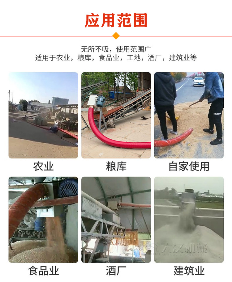 吸糧機是農場吸糧、抽糧的好幫手,適合糧食運輸、裝載、堆垛、儲存等,長度3-30米,每小時可輸送20噸糧食,它可以水平、傾斜或垂直輸送谷物。糧食垂直輸送時,每小時輸送量可達6噸。