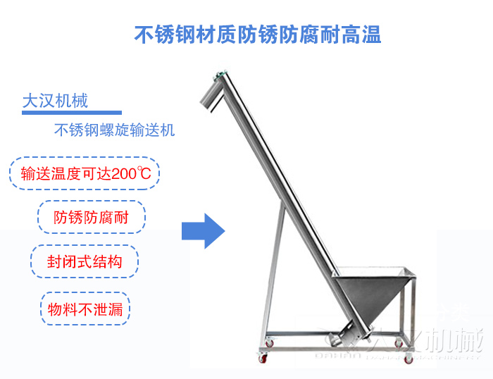 大漢機械生產的不銹鋼螺旋輸送機精選304或316等多種等級的不銹鋼,不會對食品產生污染或是腐蝕等安全問題,不銹鋼螺旋輸送機廣泛應用于各個食品(如:咖啡粉)行業,屬于食品及專用的機械設備材質。