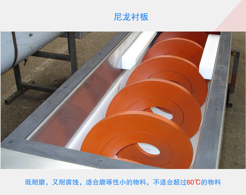 尼龍材質的襯板是采用高密度聚四氟乙稀材質制成的,既耐磨,又耐腐蝕,適合磨琢性小的物料,但是對于物料溫度要求相對嚴格,不適合超過60℃的物料。