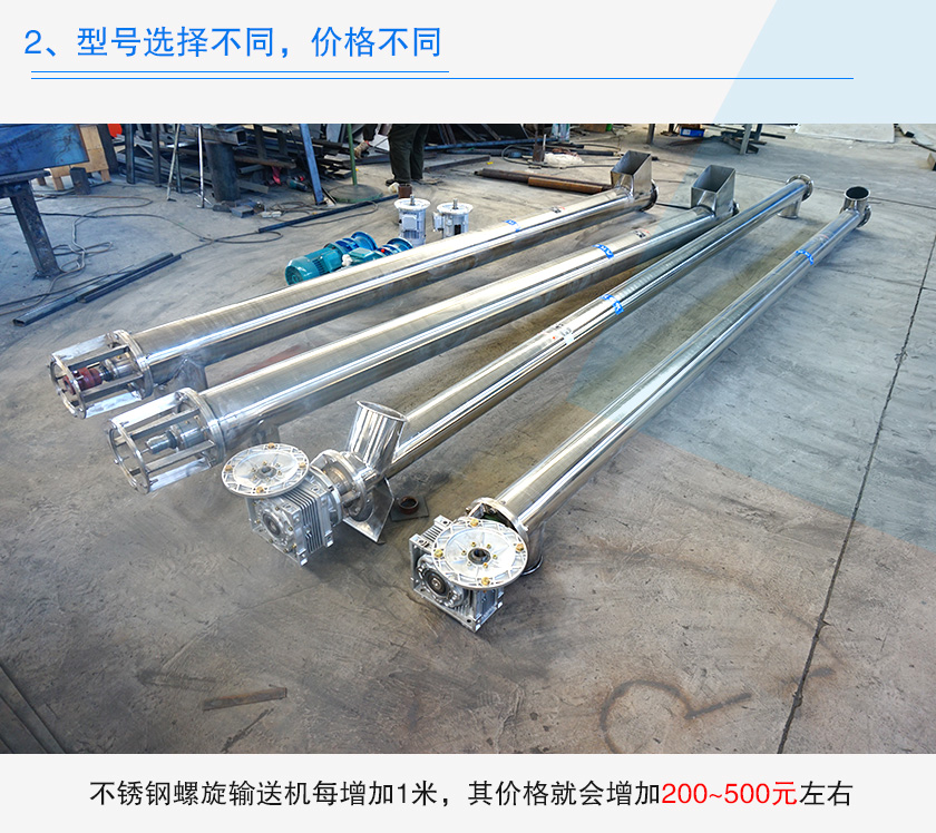 不銹鋼螺旋輸送機直徑從100~1250mm之間,選擇不同直徑的設備對于輸送量是有影響的,輸送量越大,選擇的管徑就越大,其價格就會越高,而且選擇的設備長度不同,其價格越會有所變化,不銹鋼螺旋輸送機每增加1米,其價格就會增加200~500元左右。
