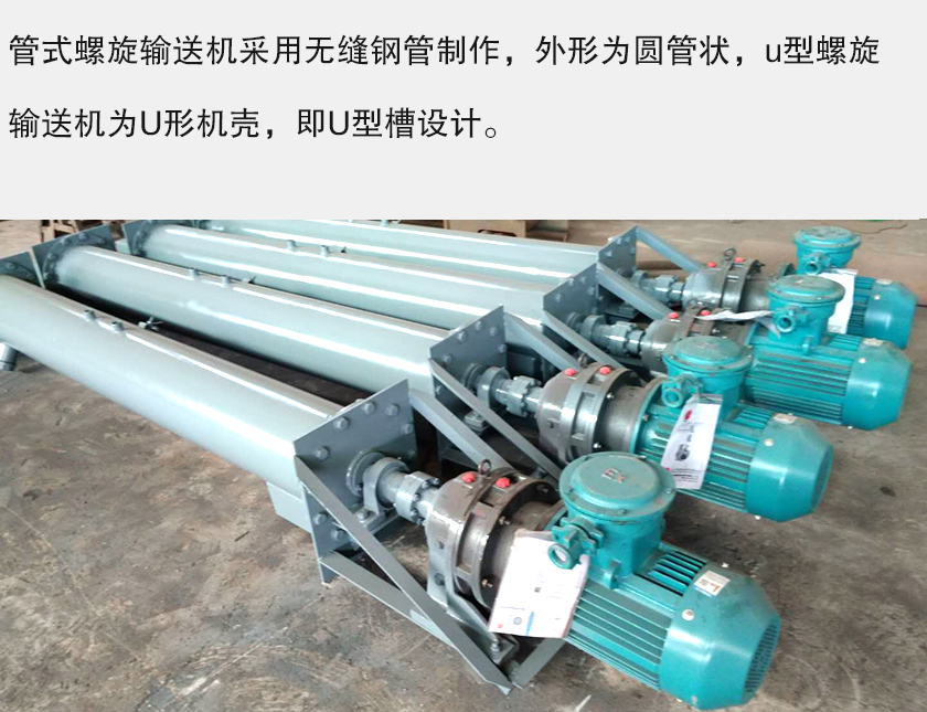 管式螺旋輸送機(jī)采用無縫鋼管制作,外形為圓管狀,u型螺旋輸送機(jī)為U形機(jī)殼,即U型槽設(shè)計(jì)。