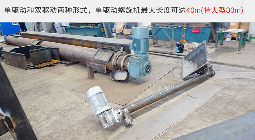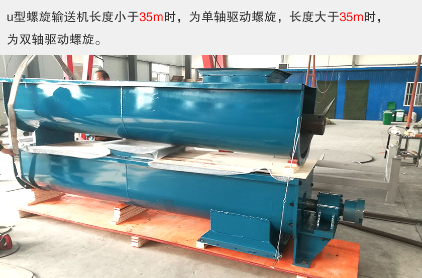 u型螺旋輸送機(jī)長(zhǎng)度小于35m時(shí),為單軸驅(qū)動(dòng)螺旋,長(zhǎng)度大于35m時(shí),為雙軸驅(qū)動(dòng)螺旋。u型螺旋輸送機(jī)適合小范圍輸送,不宜長(zhǎng)距離輸送。