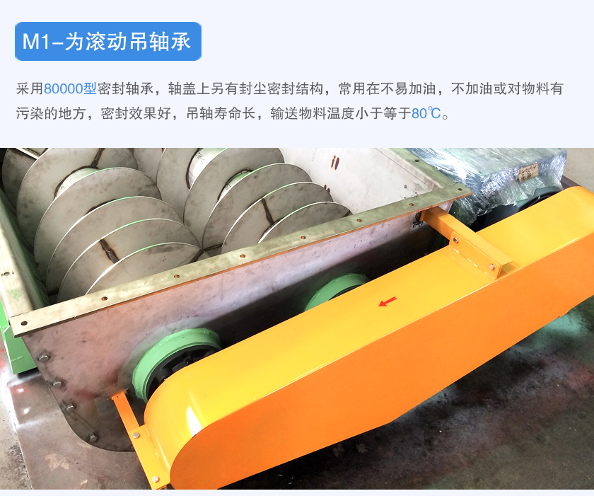 采用80000型密封軸承,軸蓋上另有封塵密封結構,常用在不易加油,不加油或對物料有污染的地方,密封效果好,吊軸壽命長,輸送物料溫度小于等于80℃。